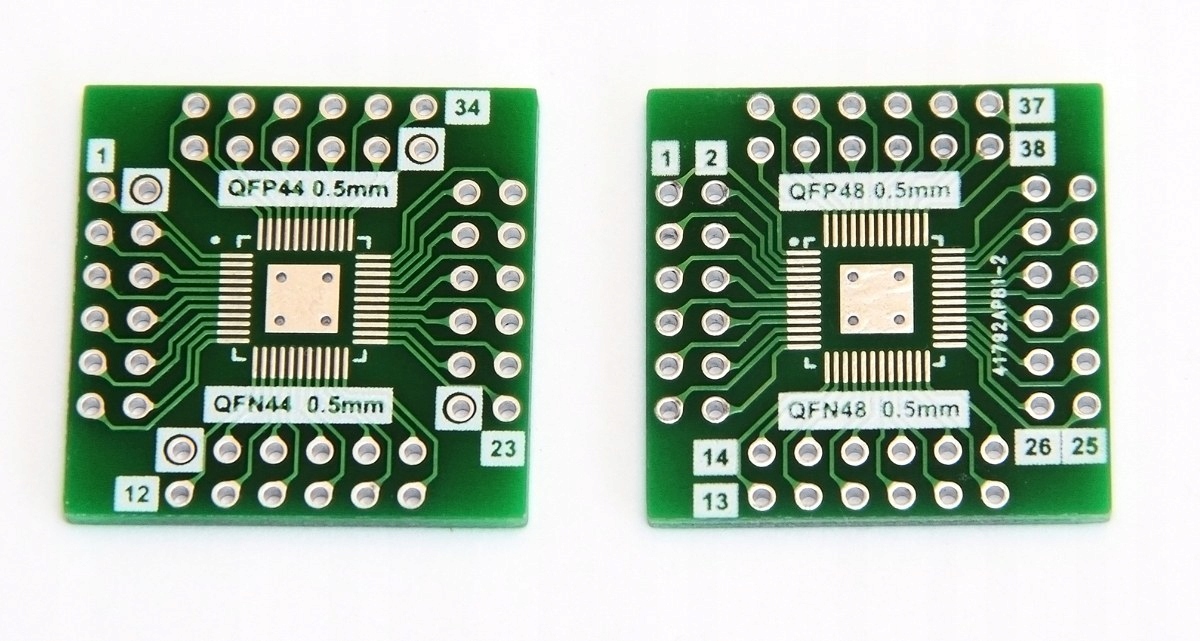 Адаптер QFN44 з одного боку та адаптер QFN48 з іншого боку, крок 0,5 мм на крок DIP 2,54 мм. Виготовлена з двостороннього ламінату з металізацією отворів FR4 1,6 мм. Завдяки металізації паяльні площадки мають набагато більшу механічну міцність і немає небезпеки їх відклеювання.