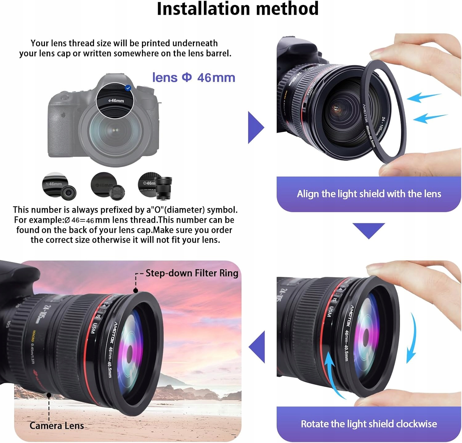 【2】AMOTOK. Цей кільцевий адаптер легко прикручується до передньої частини будь-якого об’єктива 46 мм і регулює розмір різьби об’єктива відповідно до розміру різьби будь-якого іншого аксесуара 40,5 мм (наприклад, фільтрів, бленд, спалахів і перетворювачів об’єктивів) та інших аксесуарів 40,5 мм.