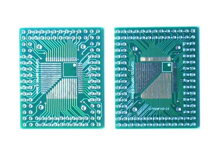Універсальний двосторонній перехідник для встановлення систем TQFP SMD на універсальні дошки, придатні для монтажу елементів THT. Можливе використання систем QFP, TQFP від 32 до 64 контактів з кроком 0,8 мм і від 32 до 100 контактів з кроком 0,5 мм. Розміри плати зменшено в порівнянні з найпопулярнішим варіантом плати - довжиною приблизно на 5 мм і становить приблизно 4,1 см