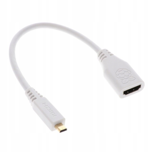 Офіційний адаптер білого кольору, оснащений штекером Micro-HDMI та роз’ємом HDMI-A (гніздо), довжиною 235 мм. Призначений для підключення стандартних кабелів HDMI до пристроїв із портом Micro-HDMI, таких як Raspberry Pi 4 і Raspberry Pi 5, він пропонує компактне та надійне рішення для передачі відео та аудіо.