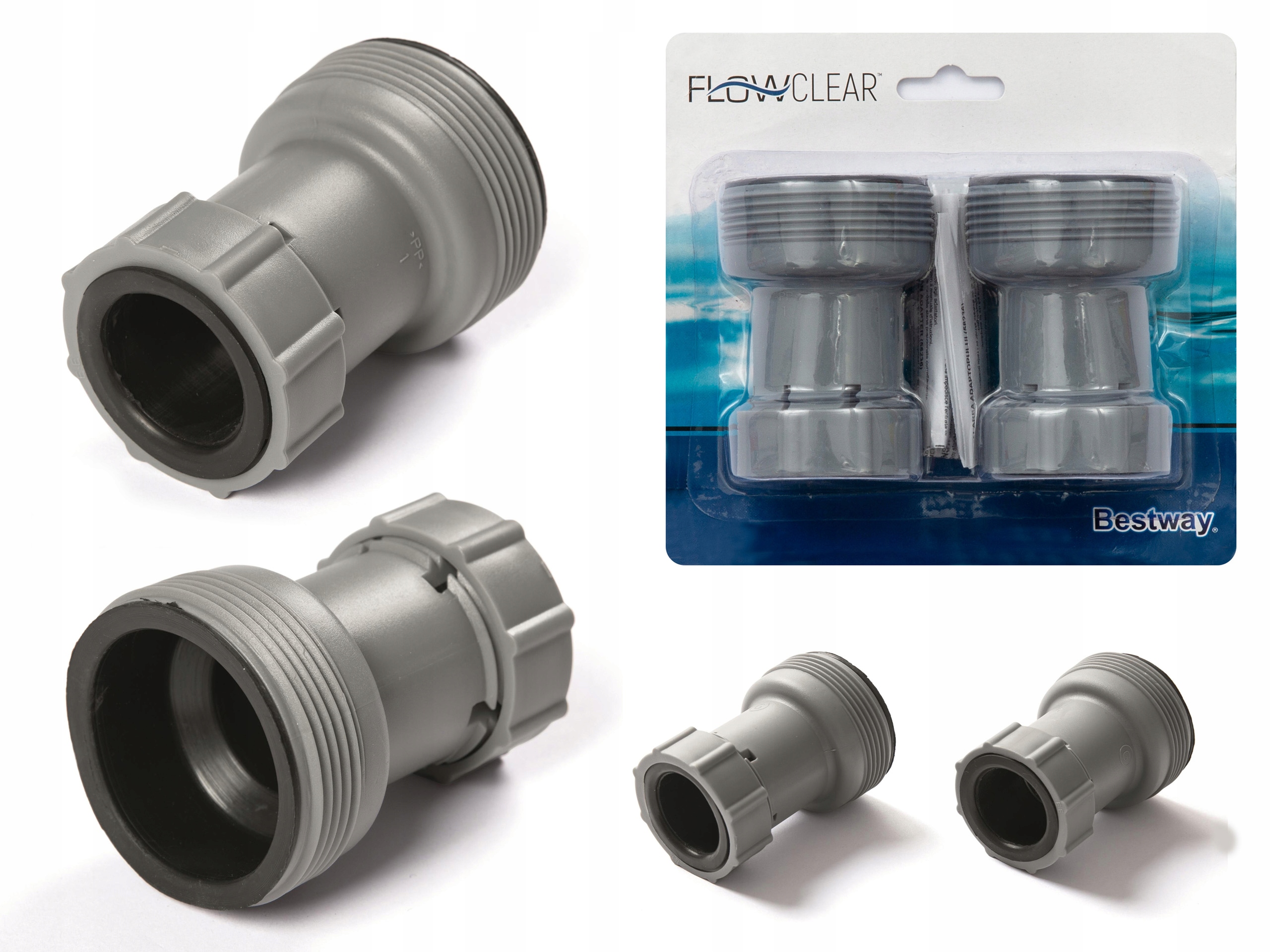 Адапер - з'єднувачі Bestway є необхідним аксесуаром, коли ви хочете підключити басейн і фільтруючий насос. Вони будуть особливо корисні, коли ви хочете замінити менший фільтрувальний насос на насос з більшою потужністю, наприклад, піщаний насос. З'єднувачі виготовлені з міцного, стійкого до корозії матеріалу, а значить, прослужать багато сезонів. Їх просто встановити. Просто приєднайте один із них до вхідного отвору шланга, а інший – до вихідного. Шланг буде з'єднувати басейн і насос. Таким чином, ви швидко збільшите потужність відкачування води і тим самим швидше очистите воду басейну від домішок.В комплект входять два редуктори (діаметр 32 і 38 мм) та інструкції зі складання.