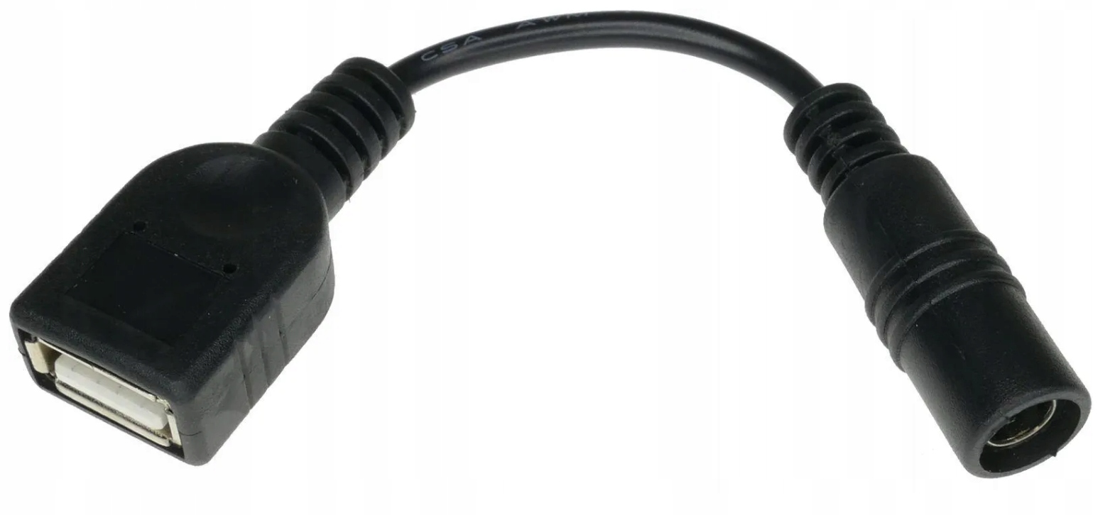 Адаптер із роз’ємом DC 5.5/2.1 мм на одному кінці та роз’ємом USB типу A на іншому. Довжина разом із кінцями становить приблизно 12 см.