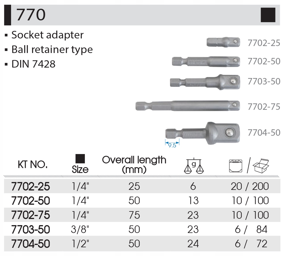 ПЕРЕХОДНИК KING TONY ПЕРЕХОДНИК ДЛЯ РУЧКИ 1/4 HEX x 1/4 75 мм 7702-75
