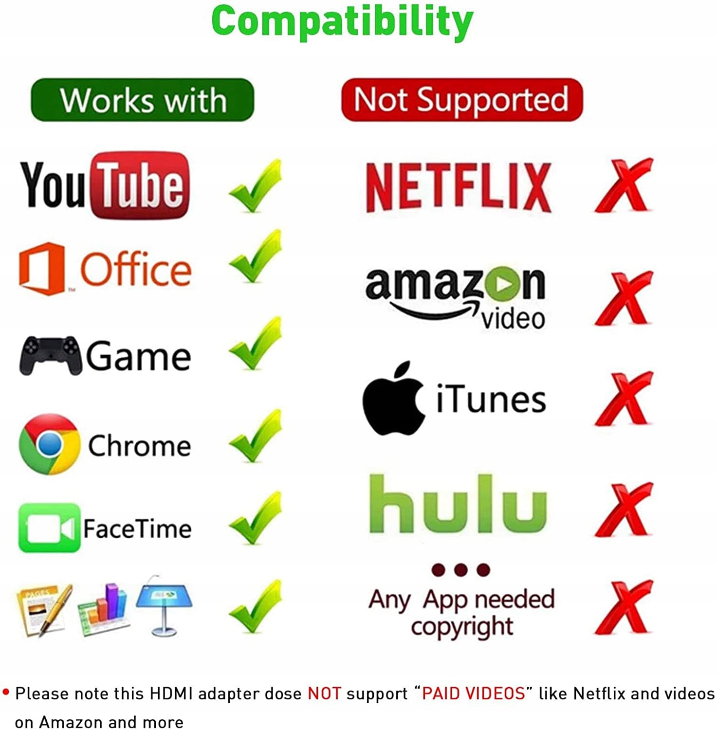 Не сумісний з HDCP: Несумісний із програмами із захистом від копіювання відео «HDCP», такими як Netflix, Amazon Video, DIRECTV, HULU, Comcast TV, Xfinity, Vudu та іншими програмами, які мають платити за перегляд телепередач.