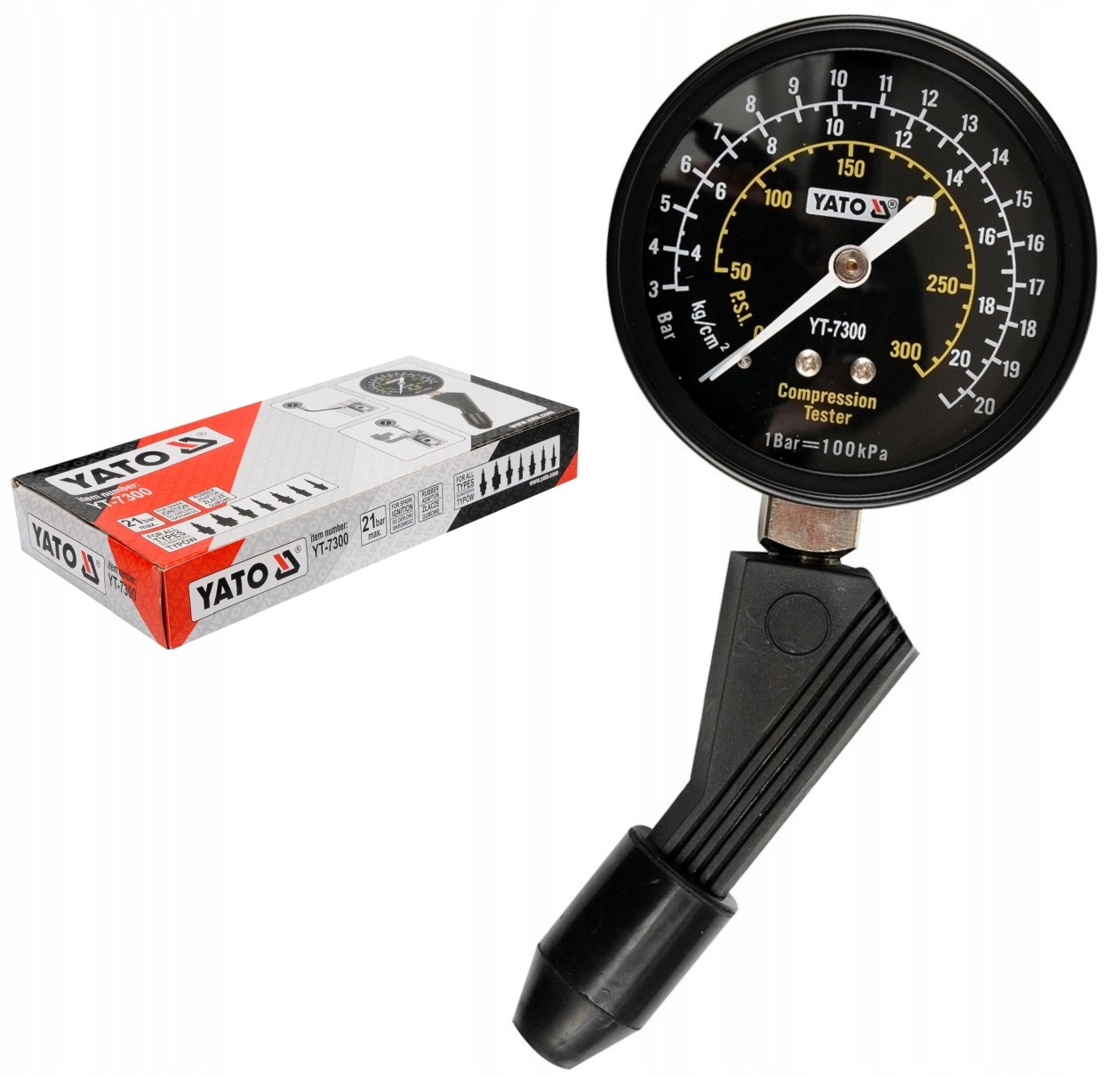 Вимірювальний пристрій, аналоговий манометр зі шкалою 3-20 бар (50-300 PSI), розміщений у корпусі адаптера. Манометр оснащено конічним гумовим наконечником, який ущільнює гніздо свічки запалювання.
