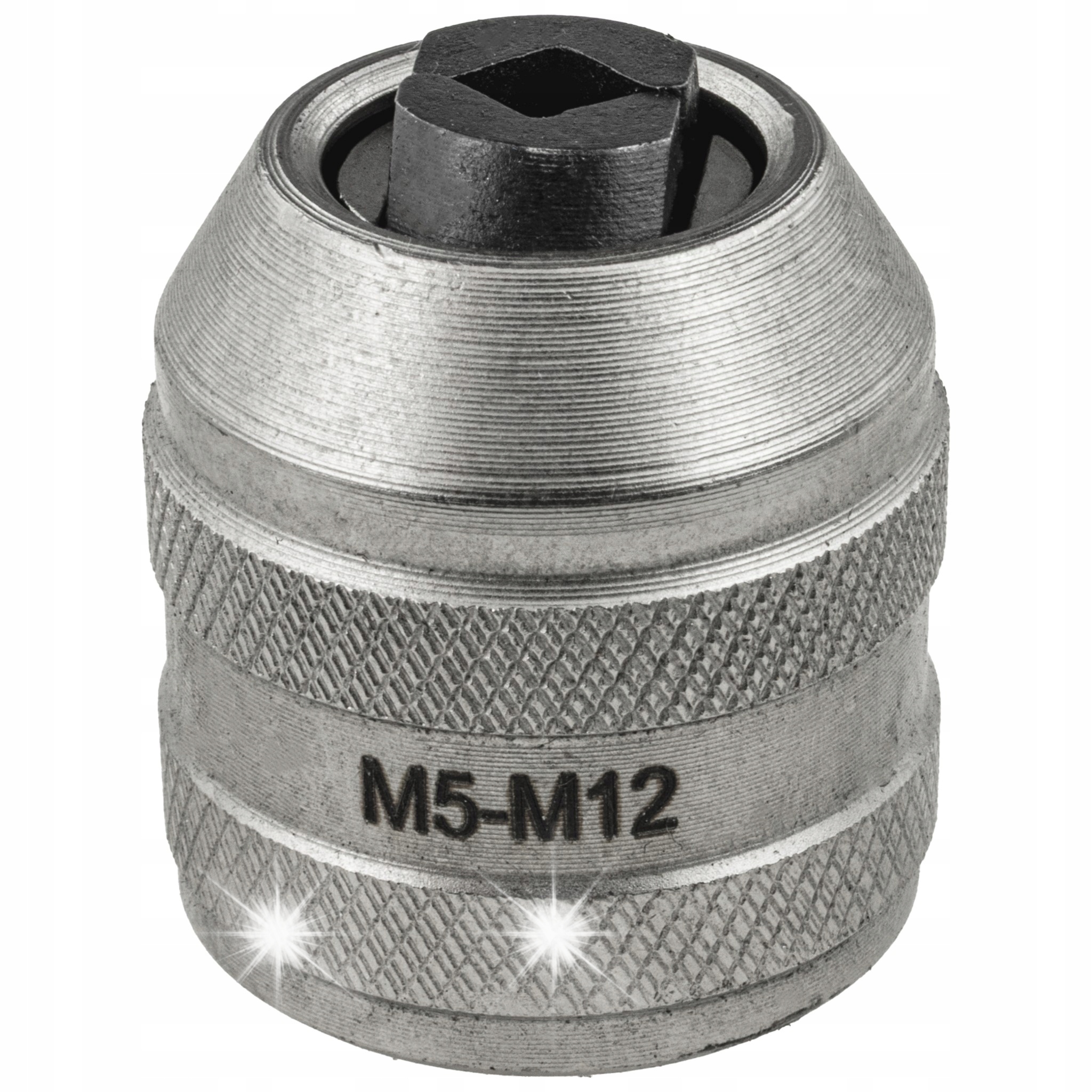 Самозатискний патрон 3/8" для мітчиків M5-M12 — це міцний інструмент, виготовлений із високоякісної хром-ванадієвої сталі (Cr-V), який гарантує довговічність і стійкість до пошкоджень. Завдяки точно відфрезерованим губкам забезпечує надійне кріплення крана, а чотири внутрішні виїмки захищають від випадкового зняття ручки. Сатин і подвійна рифлена поверхня підвищують комфорт і безпеку роботи. Квадратний хвостовик 3/8" дає змогу працювати з тріскачкою або Т-подібною ручкою.