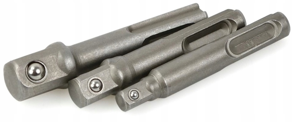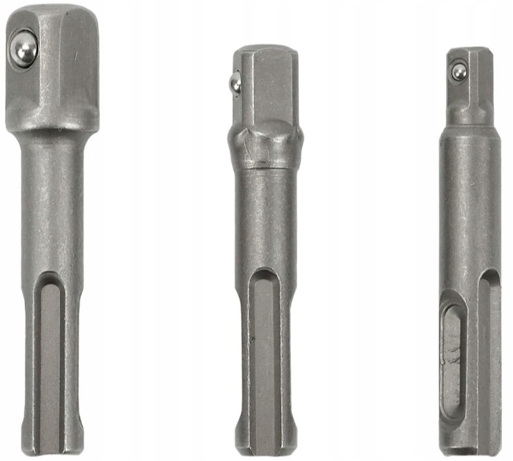 Адаптери виготовлені з міцної хромованадієвої (CrV) сталі. Набір адаптерів дозволяє використовувати головки 1/2", 3/8" і 1/4" з дрилем з патроном SDS-Plus.