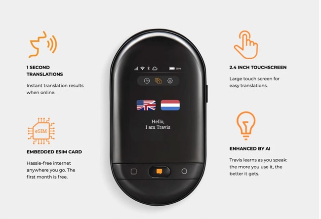 - Простий у використанні: великий 2,4-дюймовий сенсорний екран, на якому Тревіс також показує письмові переклади.