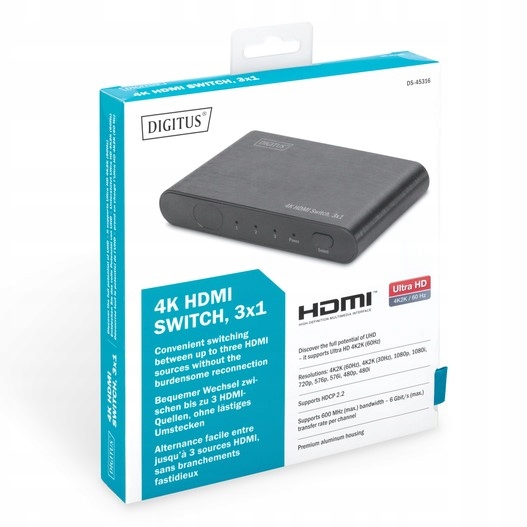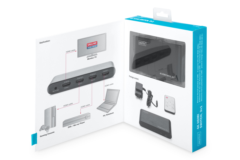 Перемикач Digitus 4K HDMI 3x1 дозволяє зручно перемикатися між 3 входами HDMI (програвач DVD/Blu-Ray, ігрова консоль, потокові пристрої, цифровий приймач тощо) за допомогою пульта дистанційного керування, вбудованого автоматичного розпізнавання або самостійно за допомогою перемикача.