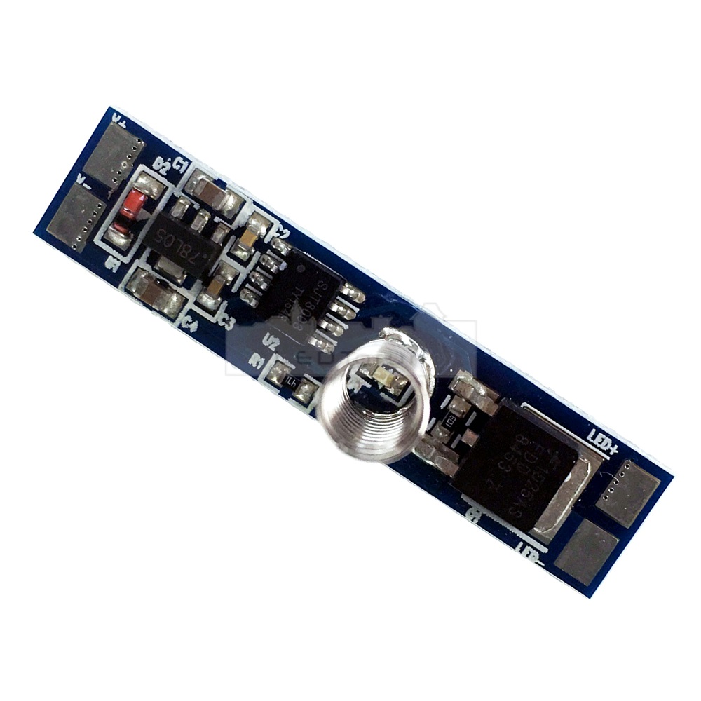 Прилад використовується для включення і вимкніть дотиком і відрегулюйте інтенсивність світла. Дотик вмикає світло, і якщо ви потримаєте його деякий час, ви можете підсилити або приглушити світлодіодну стрічку. Датчик без проблем працює під покриттям профілю товщиною до 2 міліметрів. Пружина повинна торкатися абажура зсередини. Контролер працює за технологією ШІМ, тому диммування відбувається дуже плавно, і цей контролер працюватиме не тільки зі стрічками, але й з іншими джерелами світлодіода. Точка дотику, коли світло вимкнено, позначена синім світлодіодом.