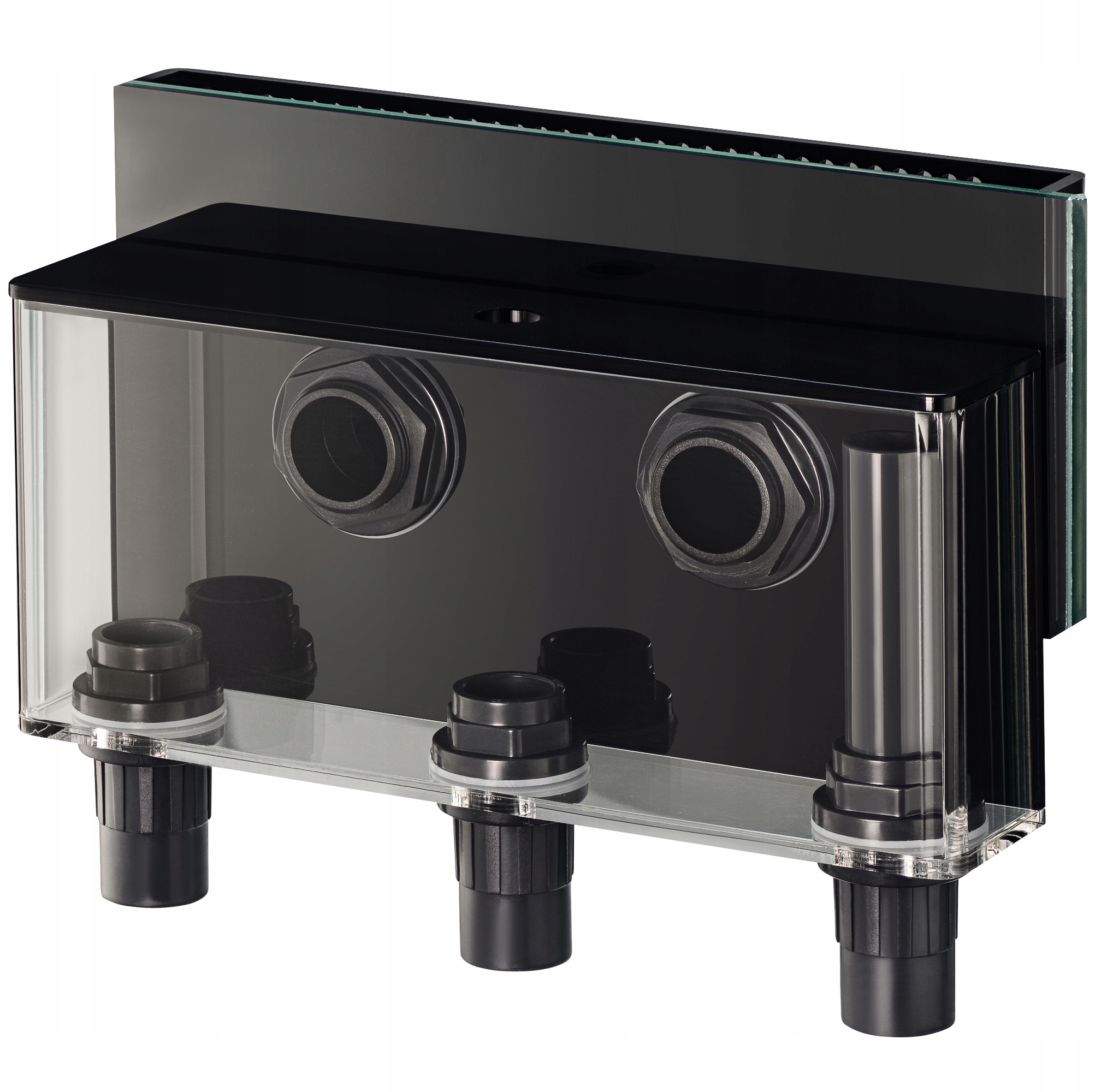 Переливна коробка OF600 ідеально підходить для підключення відстійника до акваріума. Він має невеликі розміри 29 x 15 x 10 см. Він забезпечує максимальний потік до 6000 л/год. Він виготовлений з надзвичайно міцного прозорого акрилу, що дозволяє контролювати його роботу. Він працює за принципом сполучених судин і дозволяє транспортувати воду з акваріума в відстійник. Вода, що падає через гребінь, стікає вниз. За законами фізики вона витікає за межі акваріума через отвір у склі. Звідти він надходить у відстійник через напірну трубу. Конструкція оснащена ревізією для запобігання переливу води. Після фільтрації чиста вода повертається в акваріум завдяки циркуляційному насосу.