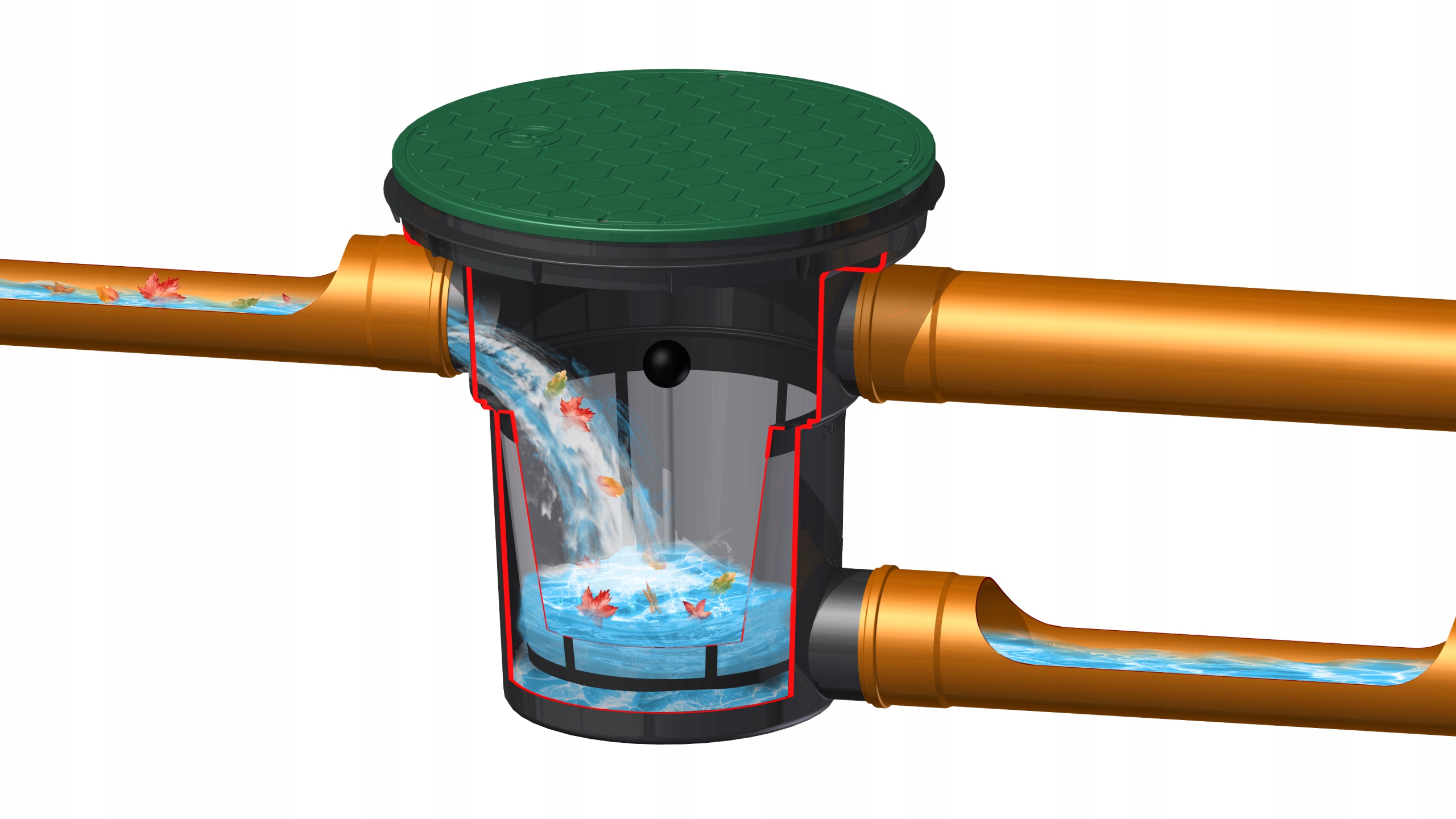 Фільтр оснащений входом, зливовим переливом з сітчастим фільтром і випуском. Зливовий перелив служить для аварійного зливу води з фільтра в разі засмічення кошика фільтра. Всі з'єднання мають діаметр Ø110 мм. Компактна конструкція фільтра захищає його від пошкоджень. Кришка, що загвинчується, полегшує обслуговування.