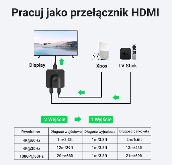 - Перемикач HDMI підтримує максимальну роздільну здатність 4K 60 Гц. Забезпечує передачу без втрат аудіо- та відеосигналів із високою смугою пропускання.
