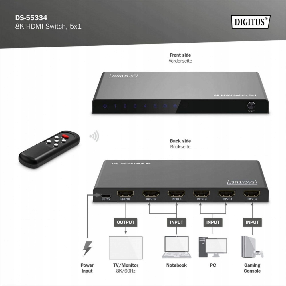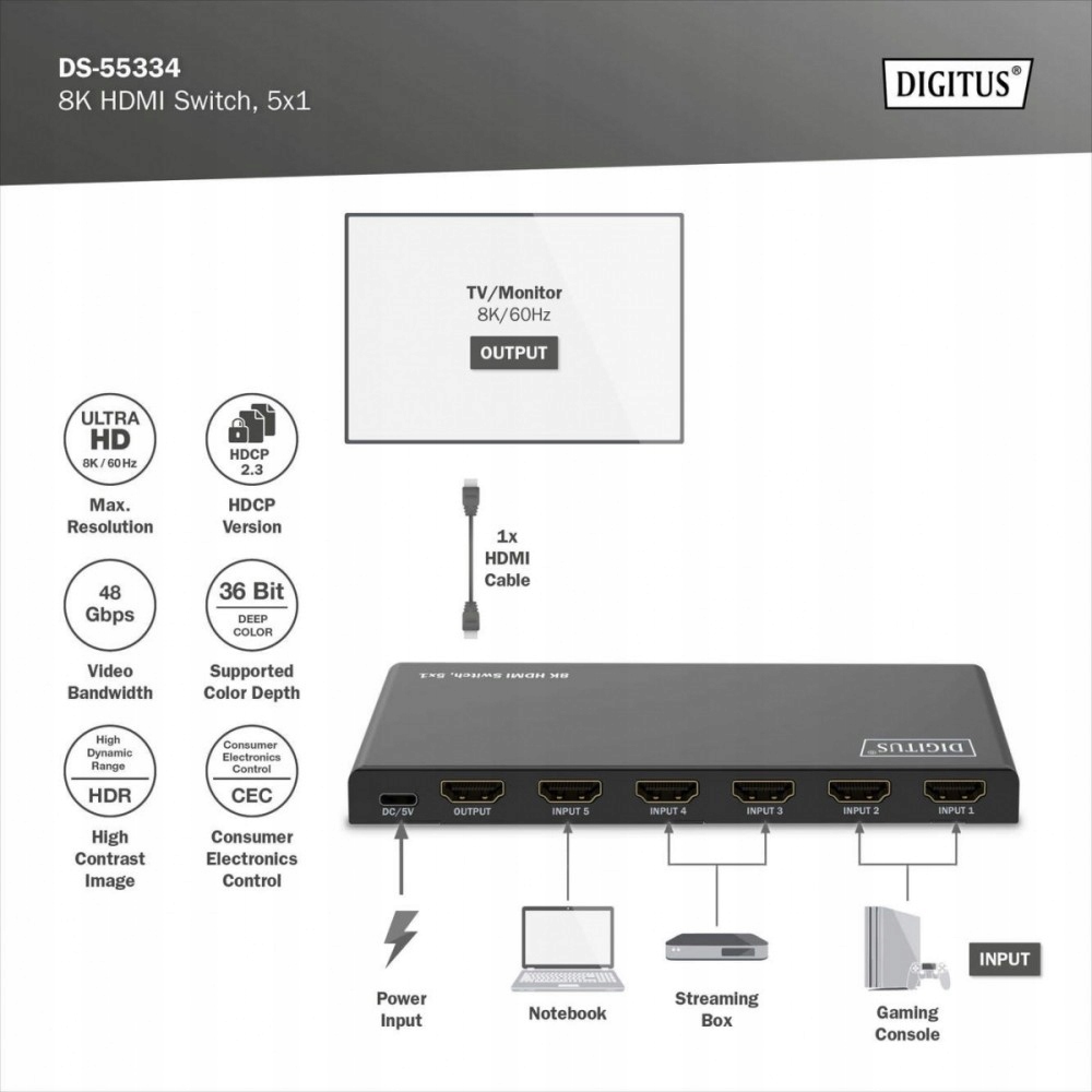 Перемикач/перемикач DIGITUS HDMI 5x1, 8K/60 Гц (4:4:4) з HDR, 48 Гбіт/с, HDCP 2.3