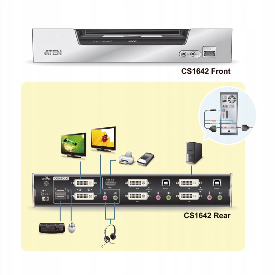 Двоекранний перемикач DVI KVMP CS1642A з USB 2.0 є піонером у функціоналі KVM, об’єднавши 2-портовий перемикач KVM із 2-портовим концентратором USB 2.0. У той же час він має можливість підключення двох моніторів DVI, що робить його ідеальним інструментом для всіх графічних дизайнерів, банкірів і фінансових консультантів, для медичних програм і комп'ютерних ігор. Крім того, CS1642 підтримує розширену передачу 2.1-канального об’ємного звуку, що забезпечує абсолютно новий вимір відтворення відео в будь-якій системі домашнього кінотеатру.