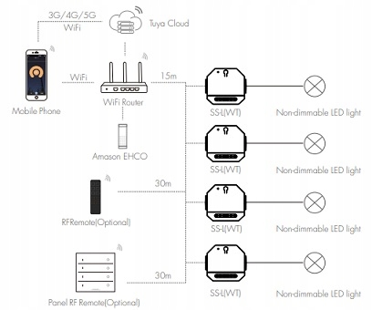SS-LWT-це бездротовий перемикач освітлення 230 В без функції затемнення. Це дозволяє через мережу Wi-Fi увімкнути / вимкнути світло, наприклад Традиційні цибулини, одноколірні світлодіодні світильники або галогени на 230Ваку. Інтелектуальна програма Tuya для мобільного пристрою, наприклад Смартфон використовується для управління комутатором. Крім того, пристрій можна керувати голосом, а також за допомогою зовнішньої кнопки натиснутої дим або бездротового радіопроменевого радіо 2,4 ГГц. Функція контролера включає: вмикання / вимкнення світла, також із затримкою ввімкнення або встановлення таймера. Операційна напруга пристрою-100-240VAC, а максимальний струм навантаження-15А. Кожен контролер SS-LWT може виступати як перетворювач Wi-RF. Він встановлений на традиційну інсталяційну банку з можливістю монтажу на DIN -рейку (адаптер у наборі).