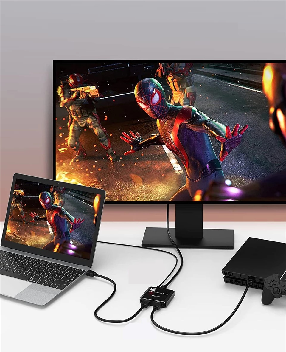 Під’єднайте пристрої, з яких отримуватиметься сигнал, наприклад декодер, консоль, комп’ютер, до DP-портів 1 і 2 комутатора, а потім під’єднайте приймачі до DP-порту за допомогою кабелю DisplayPort, наприклад телевізор або монітор, через спліттер.
