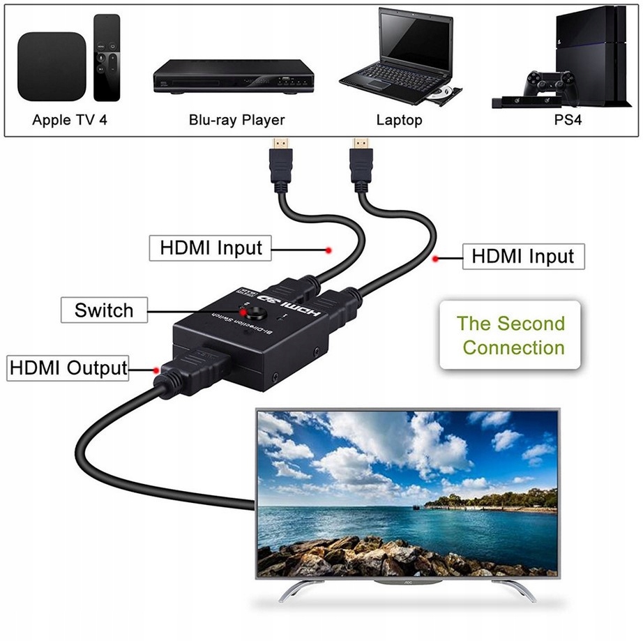 Перемикач HDMI – це пристрій, який дозволяє підключати два джерела зображення до одного входу HDMI, наприклад, ТВ-тюнер, декодер, DVD-програвач або ігрову консоль. Завдяки цьому ви можете забути про проблему відсутності роз'ємів HDMI на телевізорі, проекторі чи моніторі. Комутатор сумісний з будь-яким пристроєм, оснащеним роз'ємом HDMI. Працює за принципом Plug & Play, не потребує драйверів. Це гарантує чудову якість зображення.