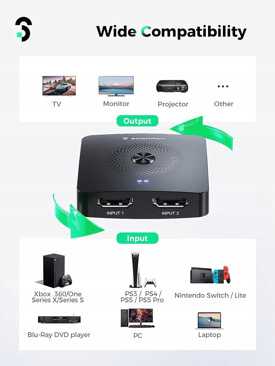 - Широка сумісність - цей комутатор 4K HDMI підтримує більшість пристроїв HDMI зі стандартним інтерфейсом HDMI. Вхід: комп’ютер, XBox 360, XBox One, PS5 / PS4, Blu-Ray DVD-плеєр, Route Roku, Chromecast, ПК тощо. Вихід: HD-Ready, телевізори Full HD, телевізори, монітори, проектори.