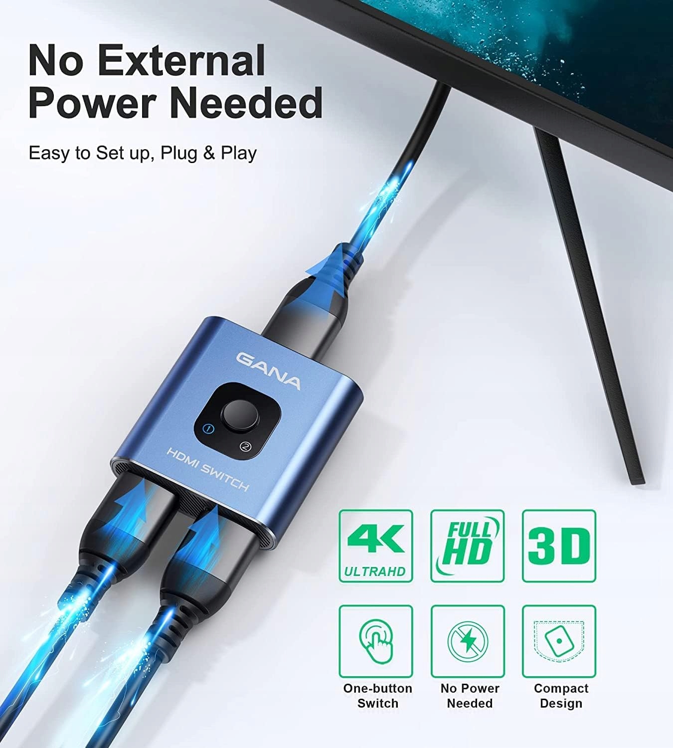 Перемикач HDMI 4k@60Hz, двонаправлений алюмінієвий перемикач HDMI GANA, вихід 2 в 1, портативний концентратор HDMI, підтримує HD, сумісний із програвачами Blu-ray Xbox PS5/4/3 і Fire Stick Roku