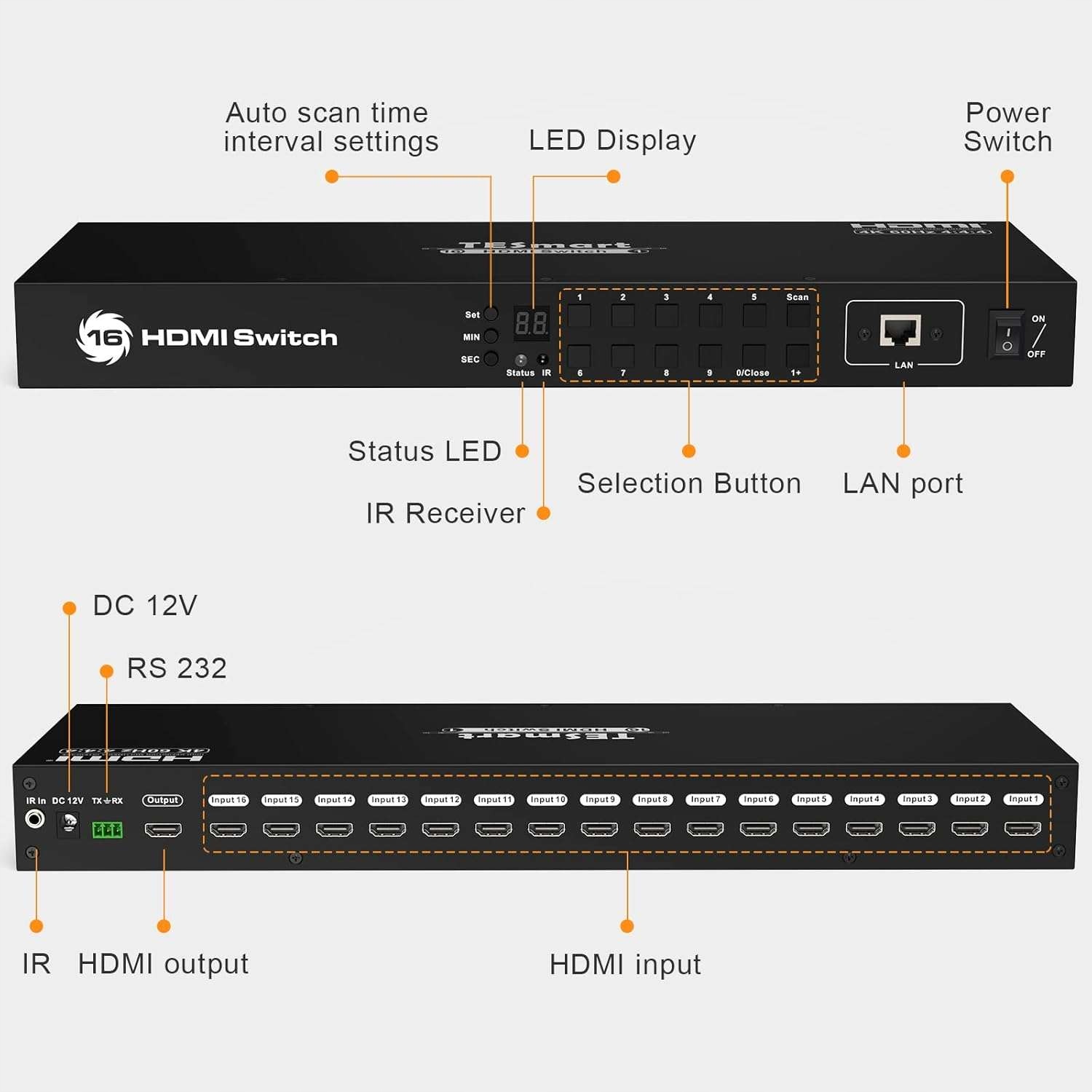 підтримує кнопки на передній панелі, ІЧ -сигнали, серійні команди RS232 або команду IP для управління комутатом HDMI. Ви можете керувати перемикачем 4K, надсилаючи команди комутації на комп'ютер через порт RS232 та порт локальної мережі, коли ви далеко від перемикача HDMI.