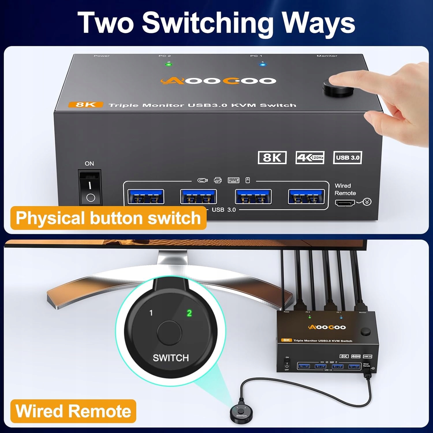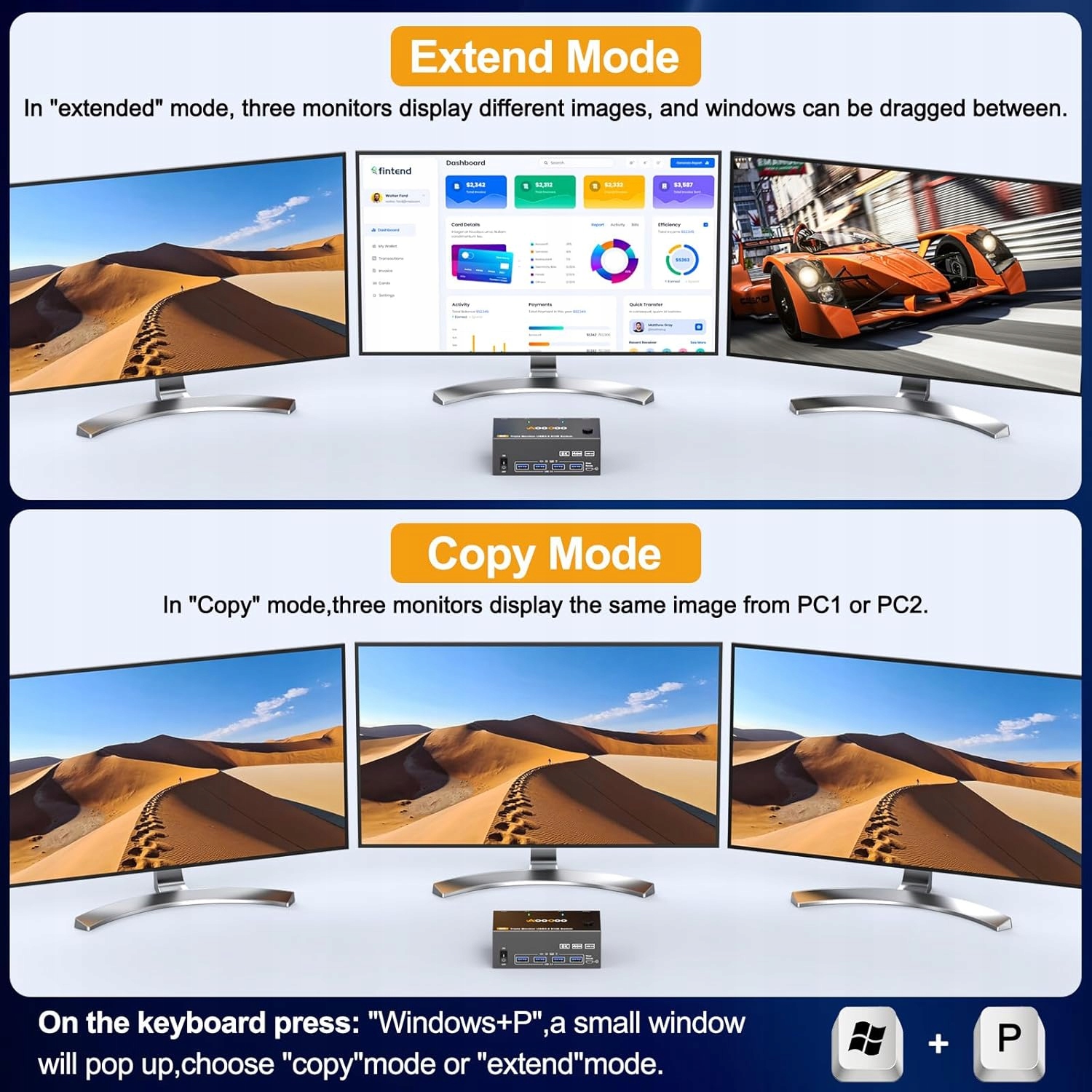- КВМ-перемикач 3 монітора - 3 КВМ-перемикачі 3 монітора: підтримує роздільну здатність до 8K 30 Гц/4K 144 Гц; Перемикач KVM для 3 моніторів: підтримує роздільну здатність до 8K 60 Гц/4K 60 Гц/2K@6 0 Гц і зворотну сумісність із меншою роздільною здатністю. Використовуйте кабель DP1.4 і HDMI 2.1, щоб увімкнути KVM-перемикач трьох моніторів.