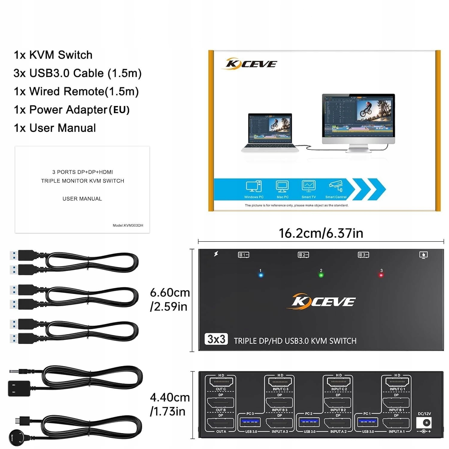 KVM-перемикач для 3 комп’ютерів, трьох моніторів (1x HDMI 2x DP) 8K або 4K до 144 Гц з 4-портовим USB 3.0, KC-KVM303DH