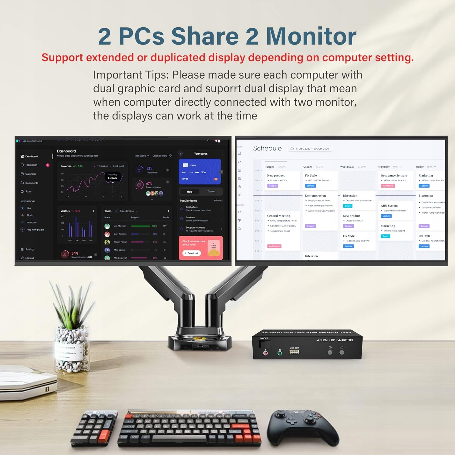 Перемикач KVM дозволяє підключати два вихідні пристрої (наприклад, комп’ютери) і перемикатися між ними на одному моніторі, заощаджуючи місце та спрощуючи керування кількома пристроями.