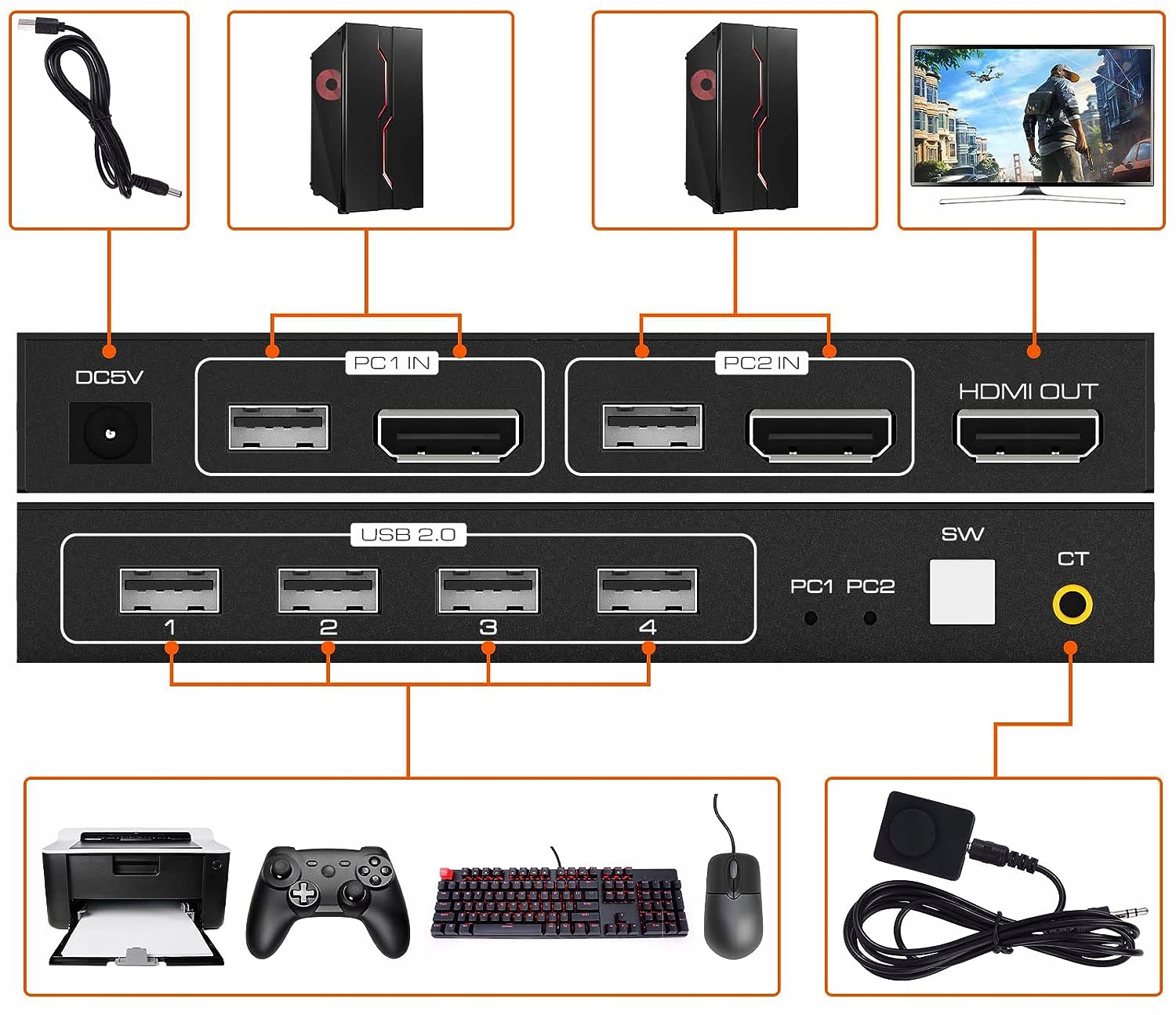 4 Натисніть кнопку на комутаторі KVM, щоб перемикати пристрій введення HDMI. Перемикач SPH-KVM23 не можна керувати за допомогою ярликів клавіш, щоб уникнути ускладнень.Висока якість 8 к@60 Гц