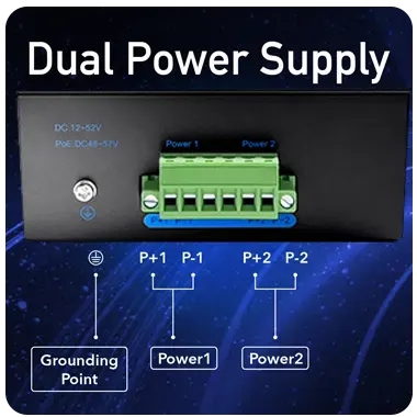 Цей промисловий перемикач Ethernet підтримує подвійне джерело живлення. Кожне з живлення зможе самостійно запустити пристрій. Завдяки цьому перемикач може працювати нормально, навіть у разі невдачі одного з джерел живлення.