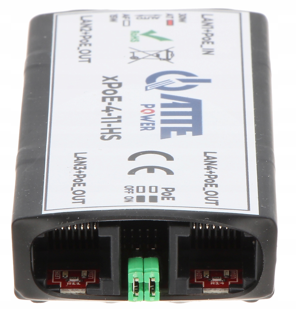 xpoe-4-11-hs була розроблена як розширювач (ретранслятор) живлення LAN та POE. Відновлює мережевий сигнал і передає джерело живлення POE на вибрані виходи. Найчастіше використовується як "підсилювач" для розширення мережі над секціями довше 100 м. Крім того, він ідеально підходить як "активний колектор" в ситуаціях, коли на одному кабелі нам потрібно запустити кілька приймачів POE (наприклад, кілька IP -камер) або коли нам потрібно створити додаткову мережеву гілку.