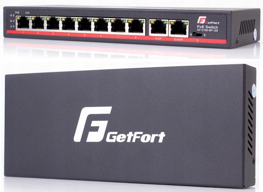 - Перемикач GetFort GF-110D-8P-120 b> — це 10-портовий некерований комутатор 10/100 Мбіт/с, який не потребує конфігурації та має 8 портів PoE.
