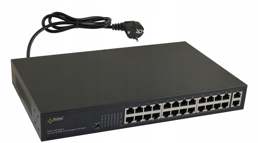 S124 до 24-портового перемикача Poe , призначений для постачання IP-камер, що працюють у IEEE 802.3AF/на стандартному. Перемикач на портах від 1 до 24 має функцію автоматичного виявлення пристрої живиться в стандарті Poe/Poe+. Порти, позначені G1 та G2, використовуються для підключення наступних мережевих пристроїв через роз'єм RJ45. На передній панелі є сигналізація робочого стану пристрою на світлодіодах.