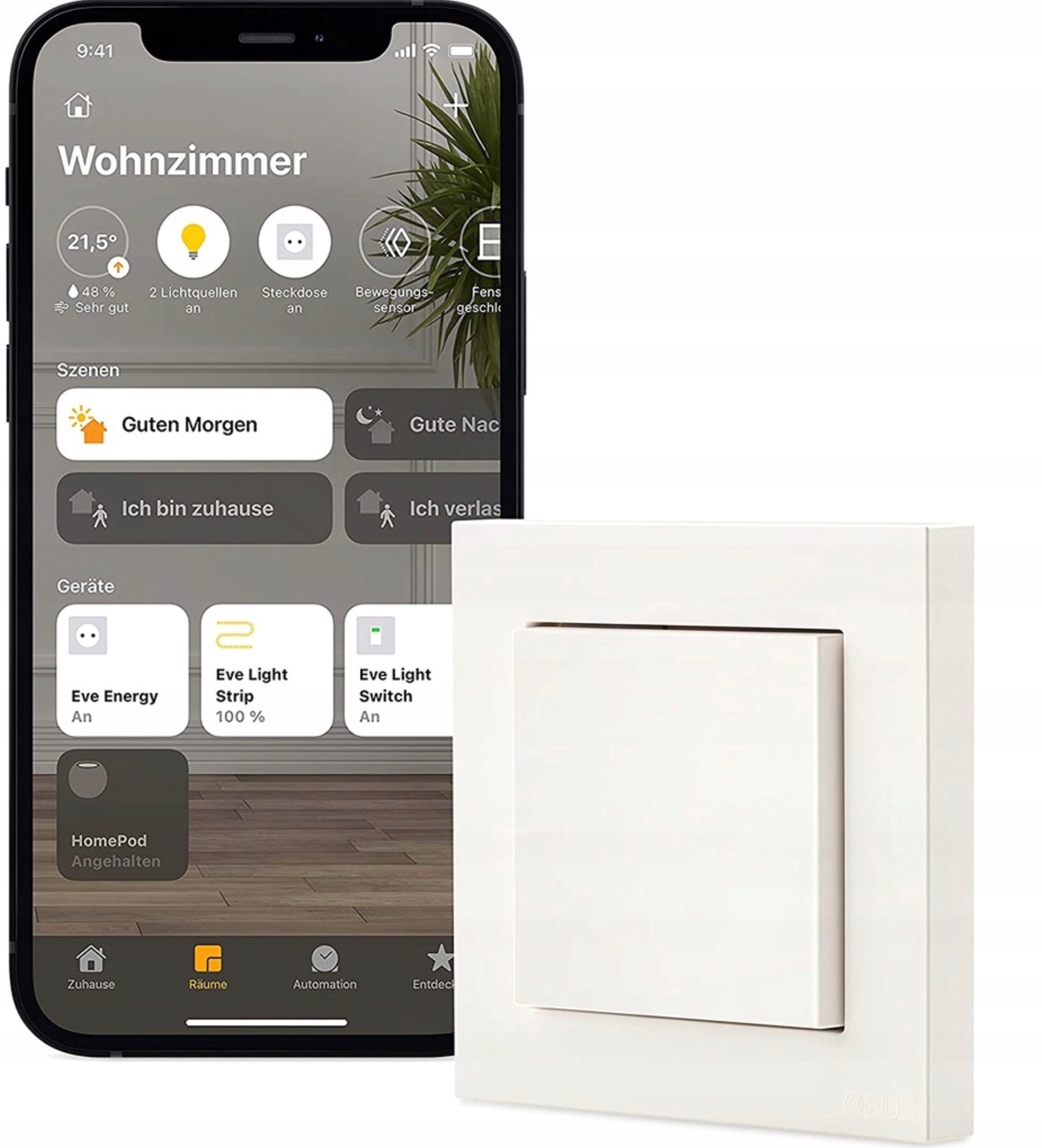аксесуари EVE готові співпрацювати з iPhone, iPad, iPodem Touch та Apple Watch, одразу після видалення з поля. Як панель управління, яка дозволяє отримати доступ до всіх пристроїв, коли ви знаходитесь на вулиці, ви можете використовувати один із своїх пристроїв Apple: HomePod, Apple TV або iPad. 5 А/1150 Вт. Доступ до перемикача світла поза домом вимагає домашнього або Apple TV, який виконує ролі маточини. Призначений лише для внутрішнього використання, у сухих приміщеннях.