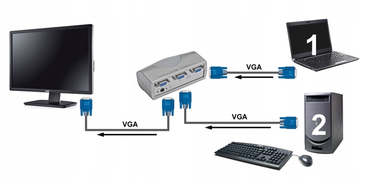 Пропонований пристрій використовується для надсилання аналогових сигналів VGA з двох джерел (наприклад, ноутбука та ПК) на один пристрій відображення (проектор, монітор, телевізійний приймач) і зручно перемикатися між джерелами. Комутатор має 2 сигнальних входу (CPU 1,2) і вихід сигналу (MONITOR) у вигляді розеток VGA HD15P: