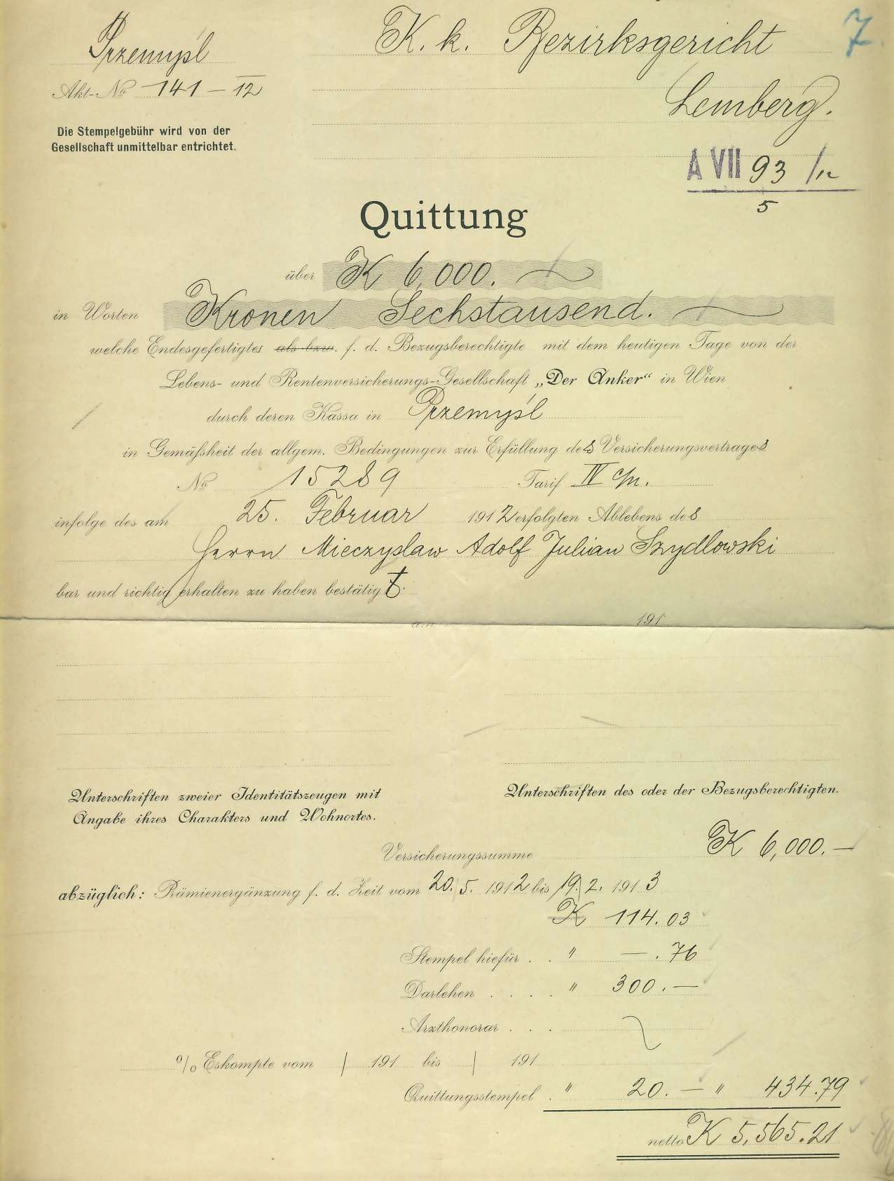 Перемишль 1912 Quittung - 6000 крон / через Лемберг