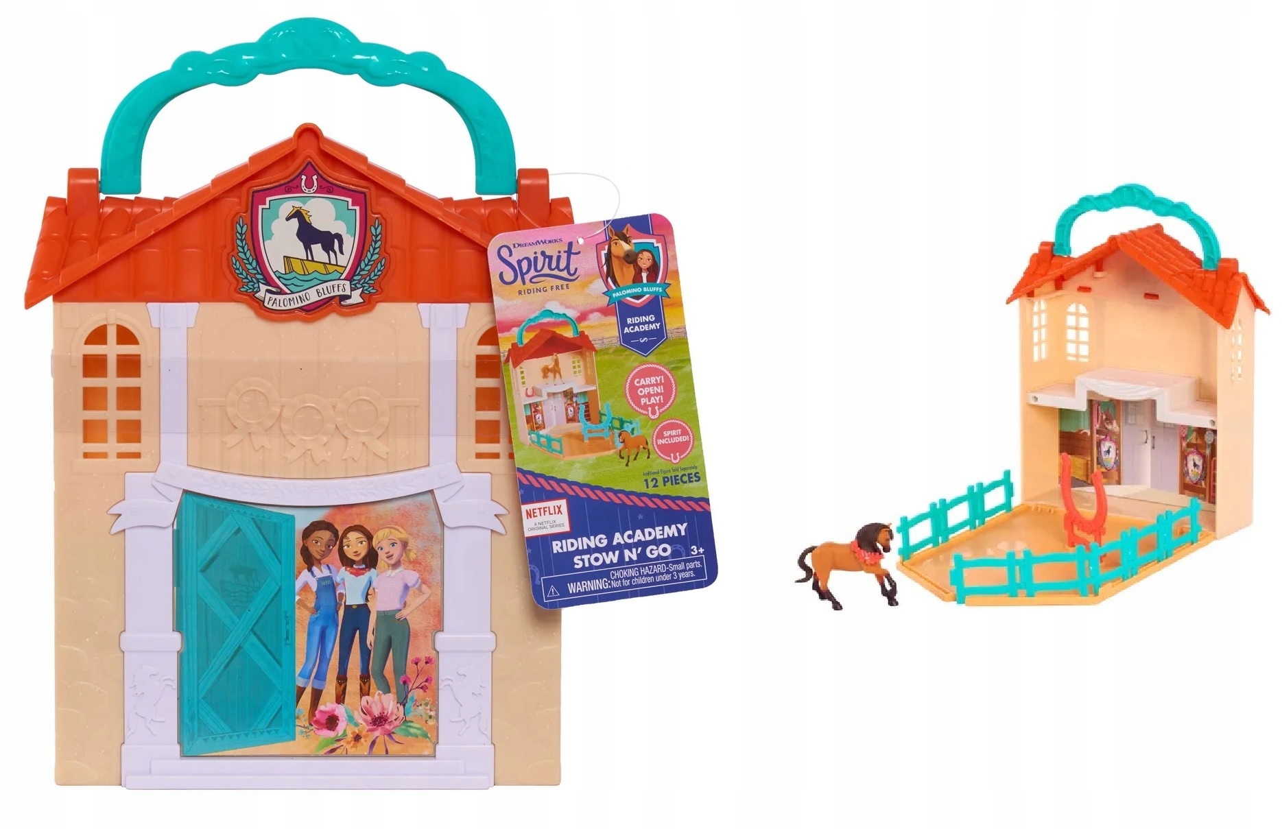 Мустанг: Дух свободи — серіал виробництва Netflix DreamWorks Animation. У ньому розповідається про пригоди відважної дівчини на ім'я Лакі, яка разом зі своїм чотирикопитним другом Привидом і групою любителів коней подорожує світом у сідлі, зустрічаючи неймовірні пригоди. Ласкаво просимо в Palomino Bluffs - чудове місце, щоб навчитися їздити верхи. Спробуйте приборкати свого коня. Розмовляйте з ним, гладьте його та доглядайте за його пишною гривою, а коли він завоює вашу довіру, осідлайте його та дресируйте в безпечному, огородженому вольєрі. У набір входить фігурка Мустанга-привида і складна стайня з пробіжкою. Практична ручка для перенесення дозволяє транспортувати іграшку куди завгодно. Додаткові аксесуари у вигляді чотирьох елементів огорожі та підковоподібних перешкод урізноманітнюють веселощі.