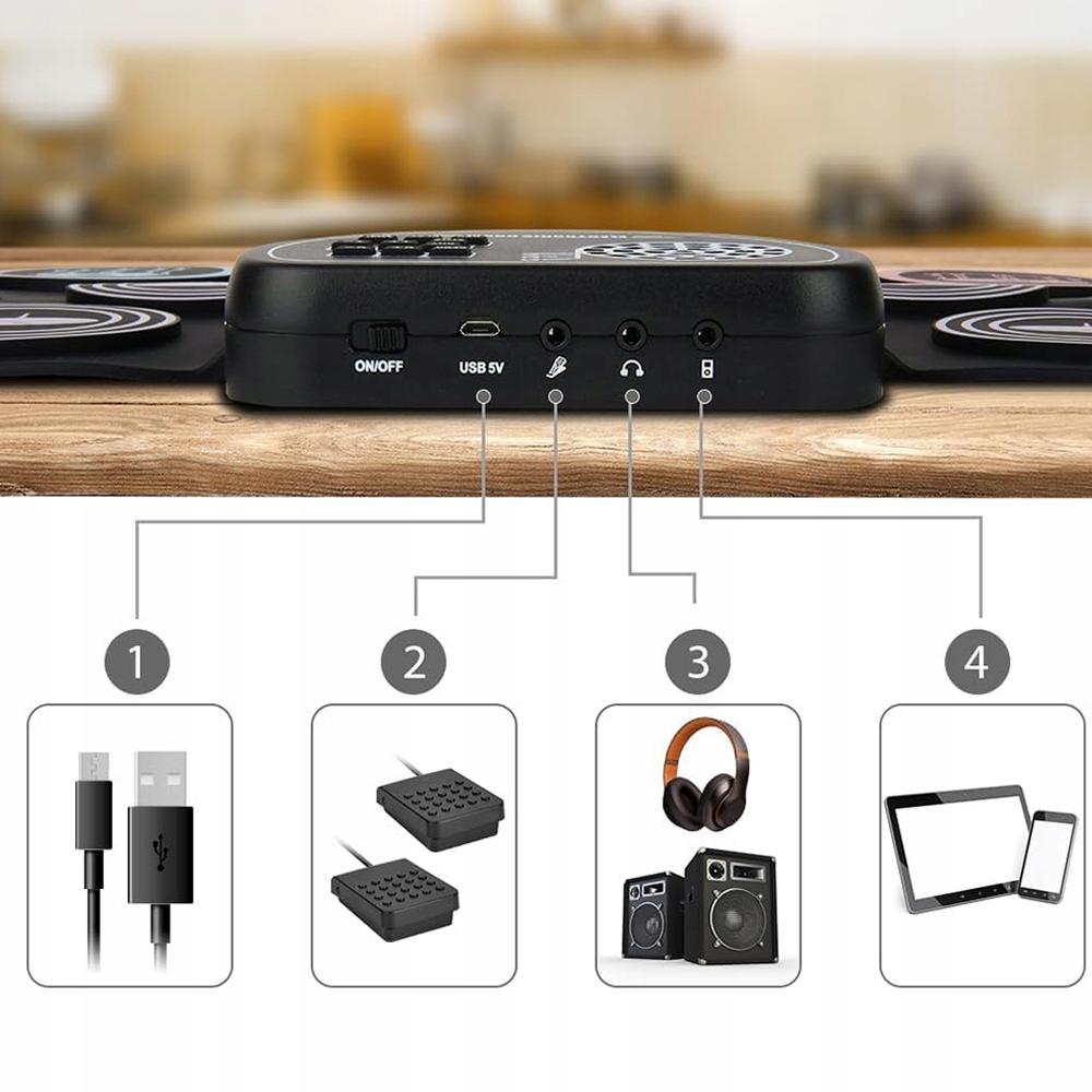 Включає 9 силіконових барабанних педів (3 повних барабани, 2 тарілки, 1 хай-хет тощо), що забезпечує чистий і ідеальний звук, точно імітуючи зворотній зв’язок справжніх барабанів набір.