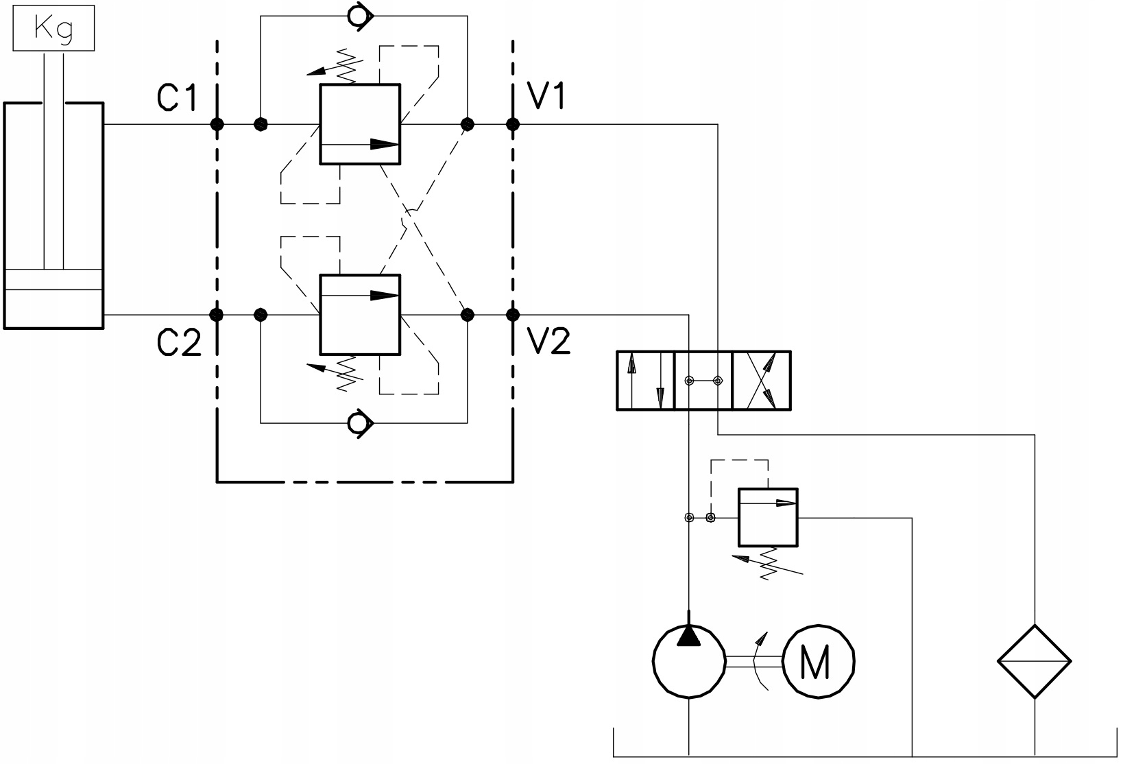 Тимбанінг-клапан Маневр. Лінія живлення і C1 і C2 до приймача . V1 або V2 впливає на тиск.