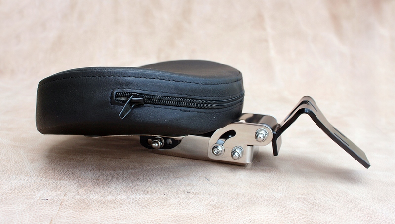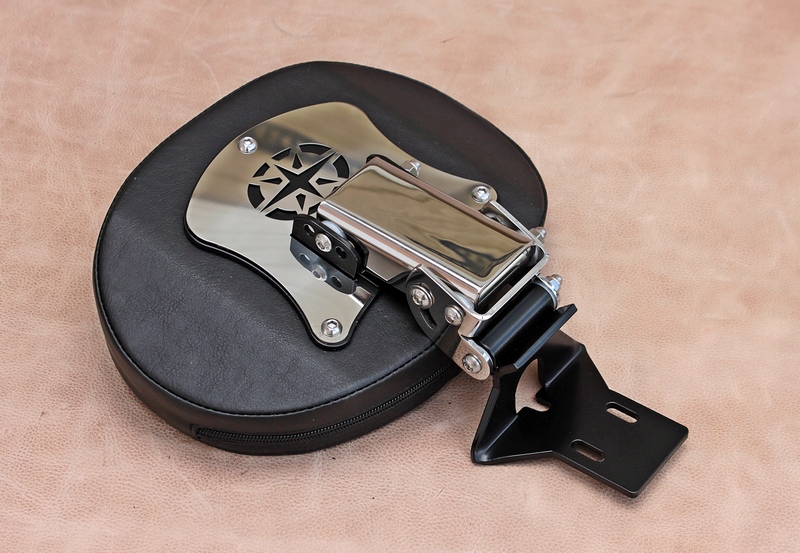 Спинка з кислотостійкої нержавіючої сталітовщиною 3/4 мм, полірована до вис. глянець забезпечує вічну довговічність і корозійну стійкість. Елементи лазерно вирізані, зварні шви шліфовані та поліровані, що гарантує якість та естетичність b>. Зручна профільована подушка обшита екошкірою, яка ідентична оббивці мотоцикла. Спинка рухома, кут нахилу спинки регулюється.