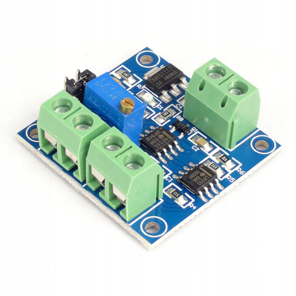 Модуль перетворювача сигналу напруги в ШІМ. Підтримує вхідну напругу в діапазоні 0-5В і 0-10В - діапазон вибирається переміщенням перемички. Його можна успішно використовувати для програмованих логічних контролерів, керування вентиляторами, насосами тощо. Він має потенціометр для налаштування ШІМ-заповнення на виході для поточної заданої напруги, завдяки чому ми можемо точно налаштувати роботу відповідно до власних потреб. Він дає стабільний сигнал ШІМ вже при 2% робочому циклі. Для зручного підключення кабелів на платі є клемні роз’єми.