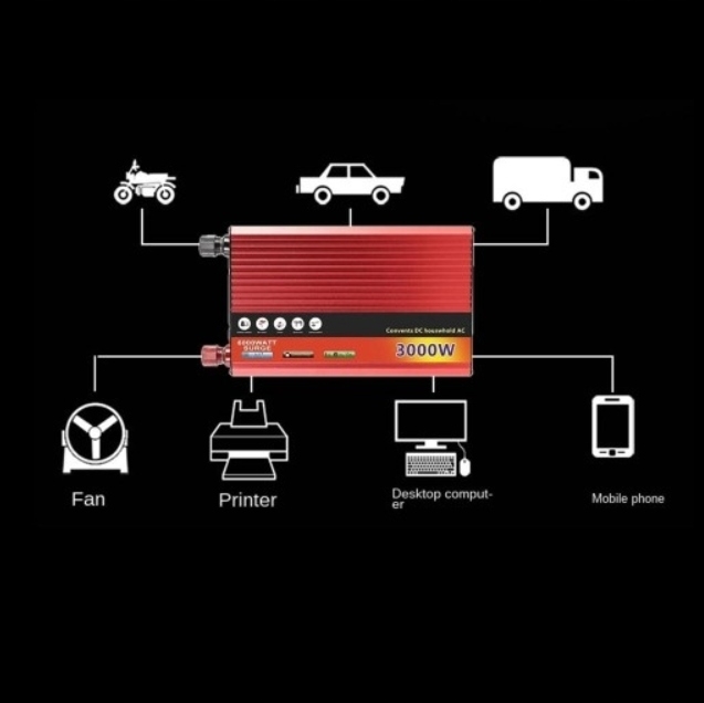 Інвертор, модель продукту: 3000 Вт Пікова потужність: 3000 Вт, номінальна потужність: 1500 Вт, вхідна напруга: 12 В Вихідна напруга: 230 В Вихідна частота: 50 Гц, струм холостого ходу 90%