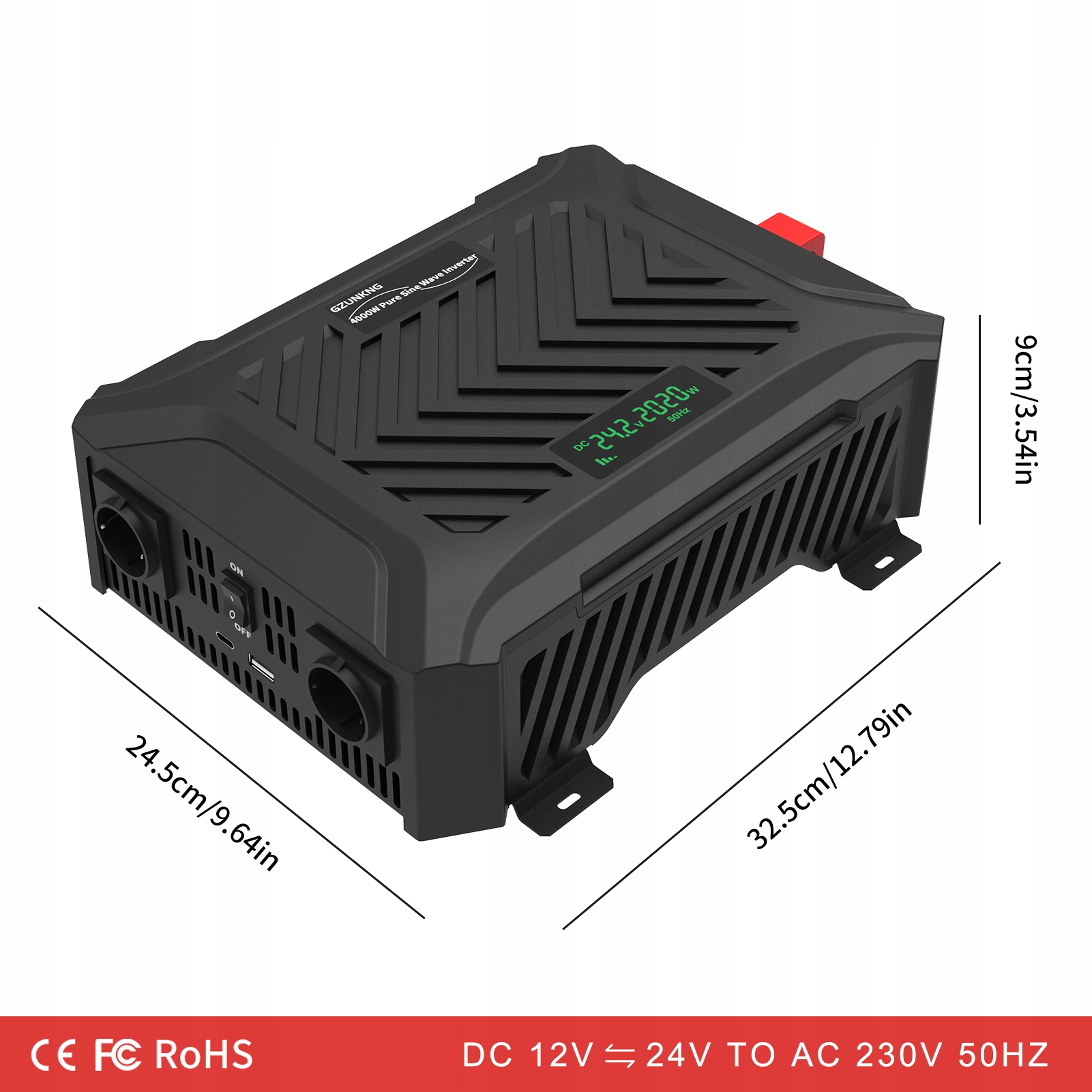 1. [12 V/24 v подвійна напруга чистий синусоїдальний інвертор]: Цей чистий синусоїдальний інвертор перетворює силу 12 В/24 В постійного струму з 220 V-240 V 50 Гц змінного струму. Стабільна вихідна потужність може досягати до 2300 Вт, а пікова потужність - 4000 Вт. У ньому є два розетки ЄС, один C, USB 2.1 порт, РК -дисплей та один вентилятор, з ефективністю перетворення понад 92%.