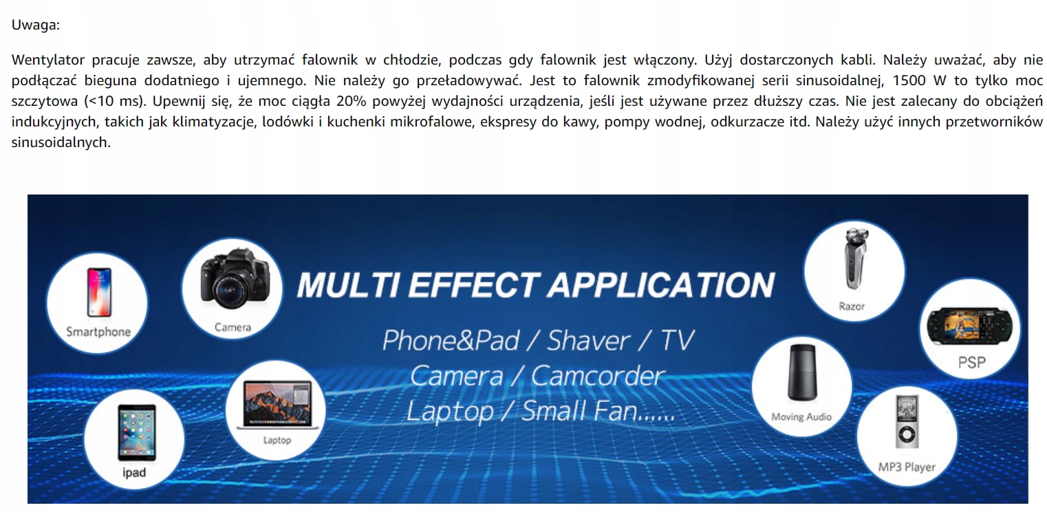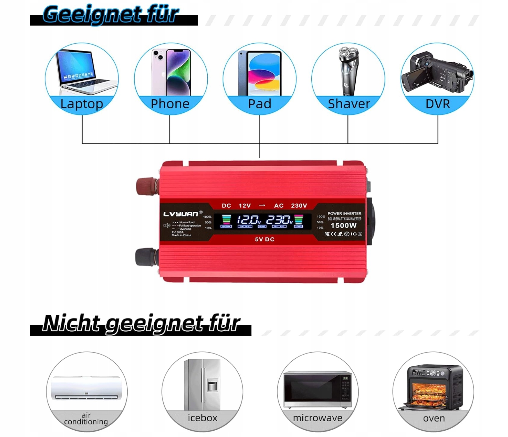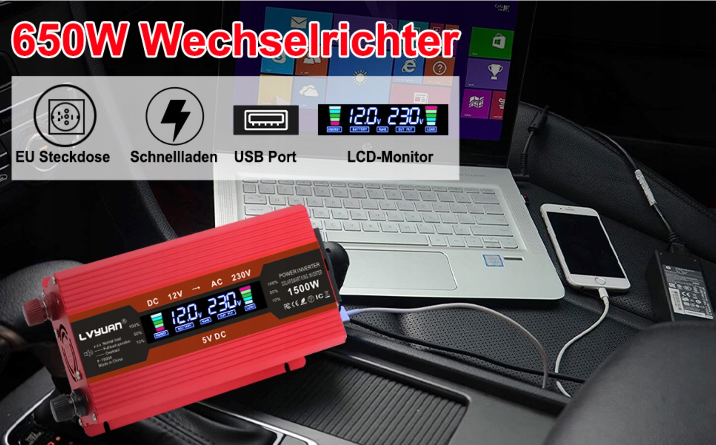 - Автомобільний інвертор, 650 Вт, пікова потужність 1500 Вт, перетворює 12 В постійного струму на 230 В змінного струму. Подвійний роз'єм USB. 1 розетка ЄС ідеально підходить для живлення вашого ноутбука, телевізора, вентилятора, DVD, GPS, лампи чи інших електронних пристроїв.