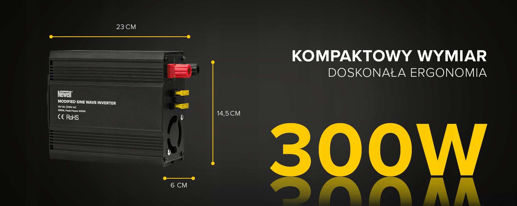 Модифікований Newell перетворювач напруги синусоїдальної форми - 12 В / 230 В, 300 Вт забезпечує максимальну робочу потужність 300 Вт і сумісний з акумуляторами 12 В. Варто пам'ятати що потужність, споживана пристроєм, підключеним до інвертора, не повинна перевищувати 88% від номінальної потужності (в даному випадку 300 Вт). Перш ніж придбати обрану модель інвертора, переконайтеся, що його параметри відповідають вашим потребам.