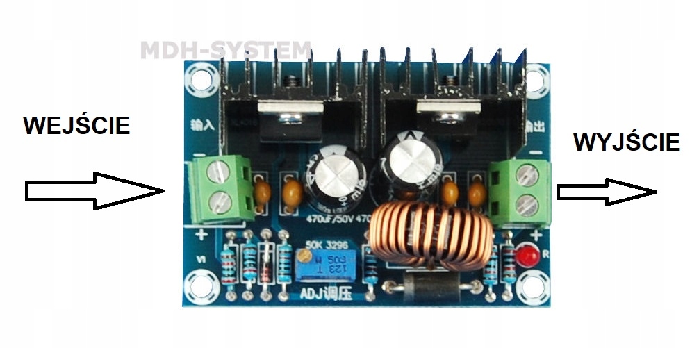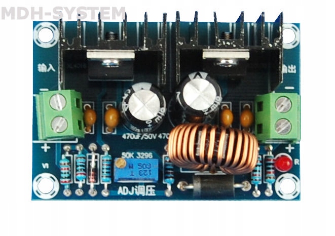 Перетворювач, який зменшує вхідну напругу з діапазону 4–38 В до вихідної напруги, що регулюється потенціометром у діапазоні 1,2–35 В.