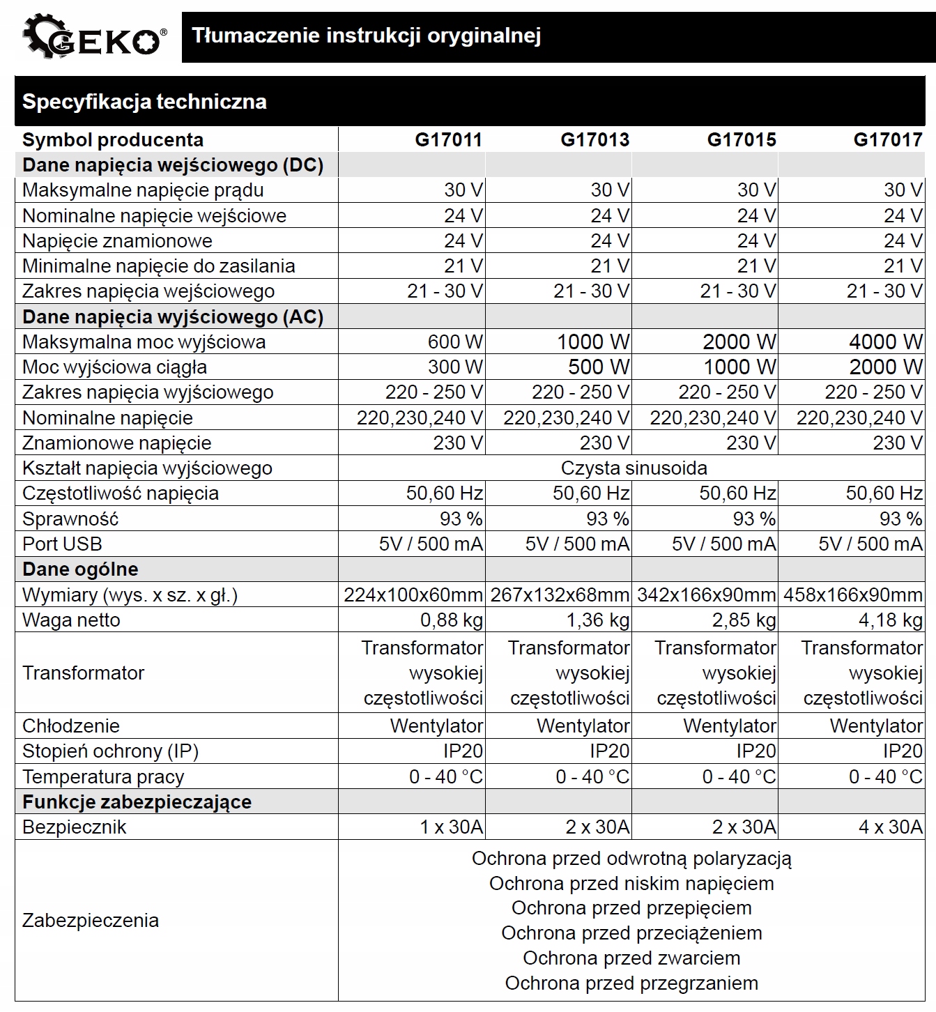 - Повна безпека - не переживайте про перенапруги, з пристроєм GEKO Ваше обладнання завжди в безпеці. Перетворювач має ряд захистів і сертифікатів, щоб він працював без перешкод