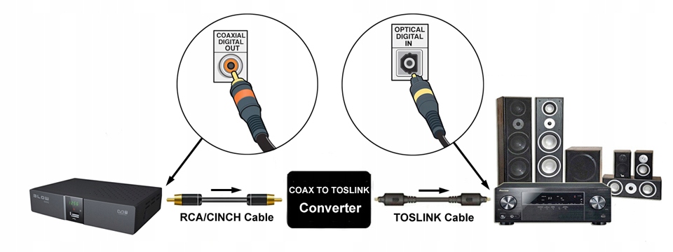 Найчастіше пристрої, що підтримують цифрове аудіо S/PDIF (приймачі, DVD-програвачі та рекордери, супутникові тюнери, консолі тощо) мають обидва типи розеток (оптичний тип TOSLINK та електричний коаксіальний тип RCA/CINCH). Однак іноді вони мають лише один тип розетки. Вирішенням проблеми підключення таких елементів аудіосистеми є конвертер COAXIAL-TOSLINK. Конвертер, який ми пропонуємо, дозволяє підключати обладнання лише з коаксіальним виходом RCA (наприклад, тюнер DVB-T, декодер кабельного телебачення тощо) до обладнання, яке має лише оптичний вхід TOSLINK (наприклад, домашній кінотеатр, ресивер).