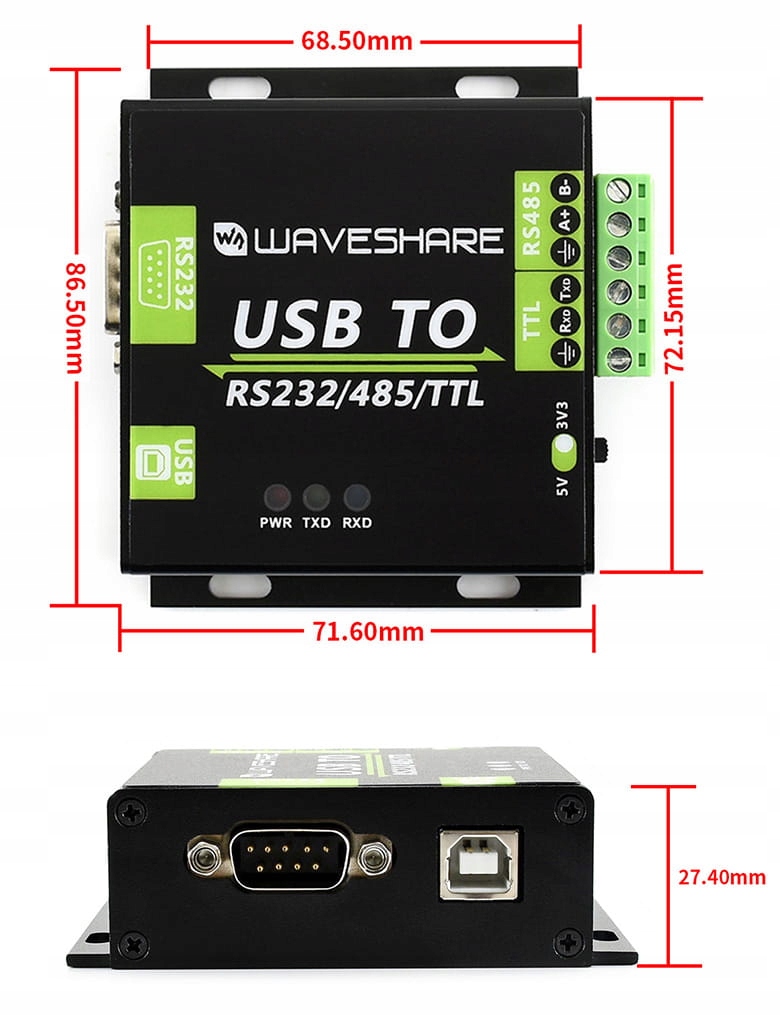 Конвертер USB в RS232/RS485/TTL із повною ізоляцією на основі оригінальної системи FT232RL. Він має вбудовані схеми безпеки, включаючи гальванічно розділені схеми живлення.