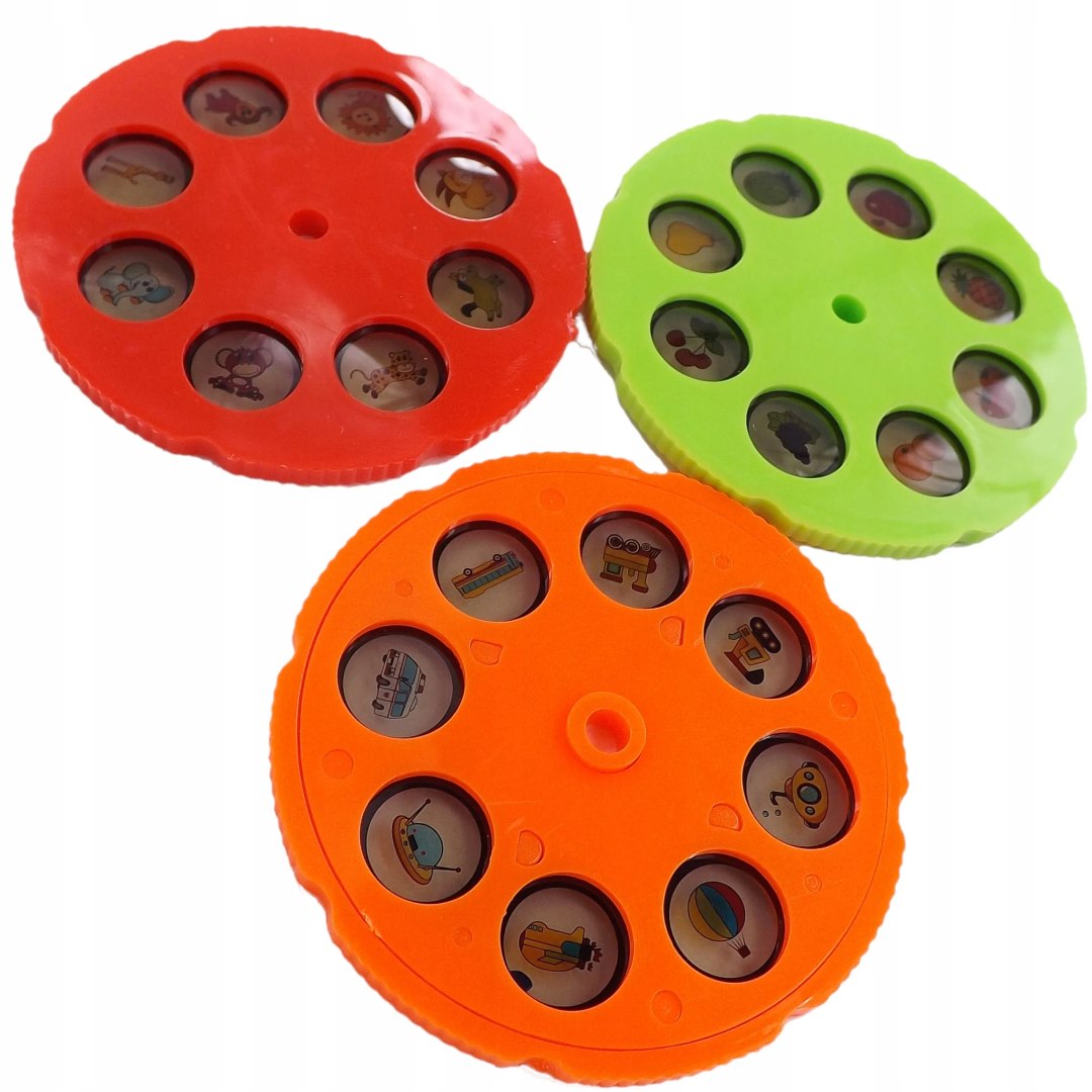 ✅ Проектор має 3 диски з тематичними конструкціями, завдяки яким дитина вивчає форми кольорів та назв тварин, транспортних засобів, а також фруктів та овочів.